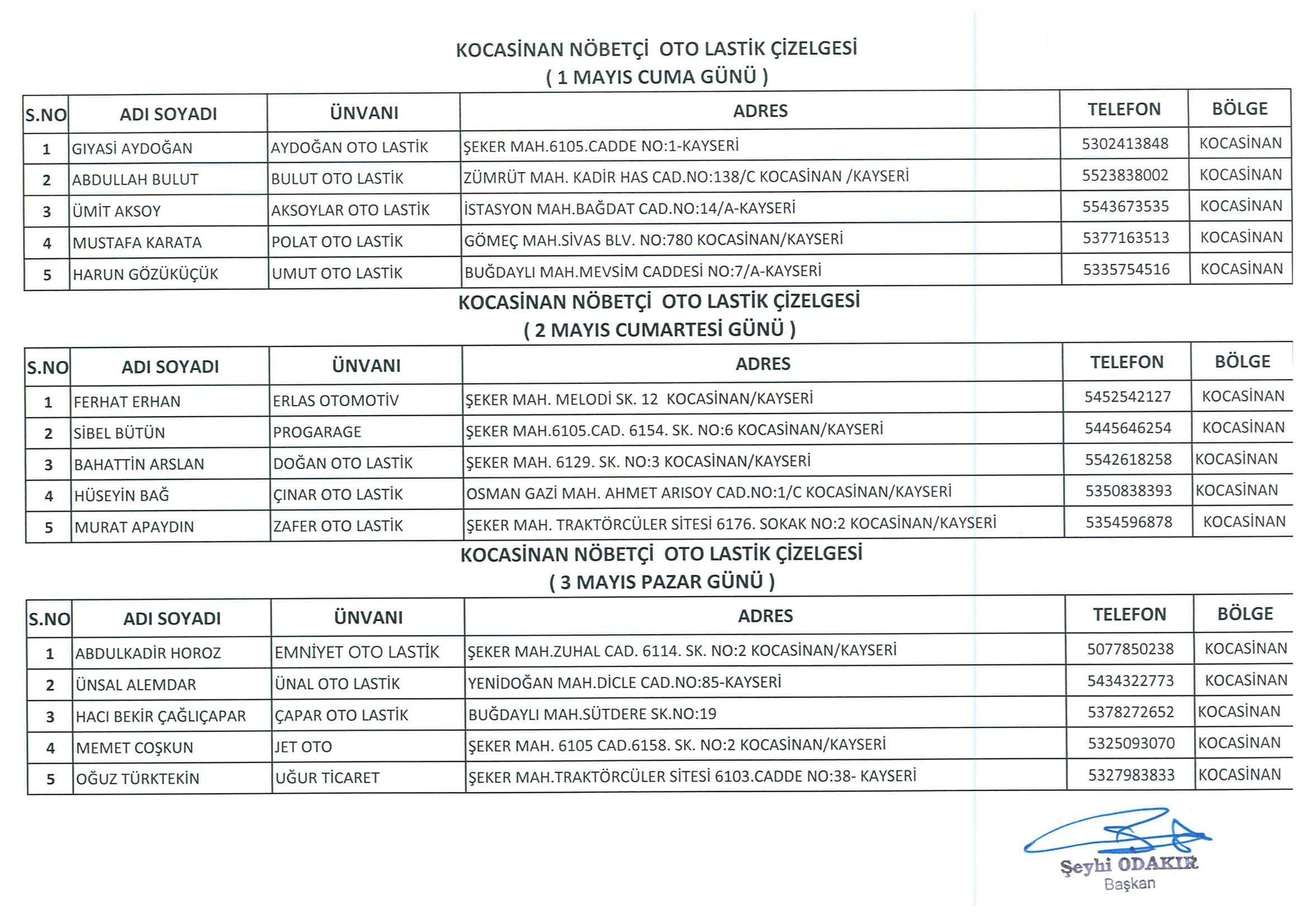 Kayseri merkez Kocasinan ve Melikgazi İlçelerinde 1-2-3 Mayıs tarihlerinde Nöbetçi Oto Lastikçi listesi