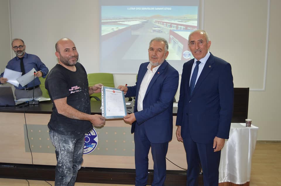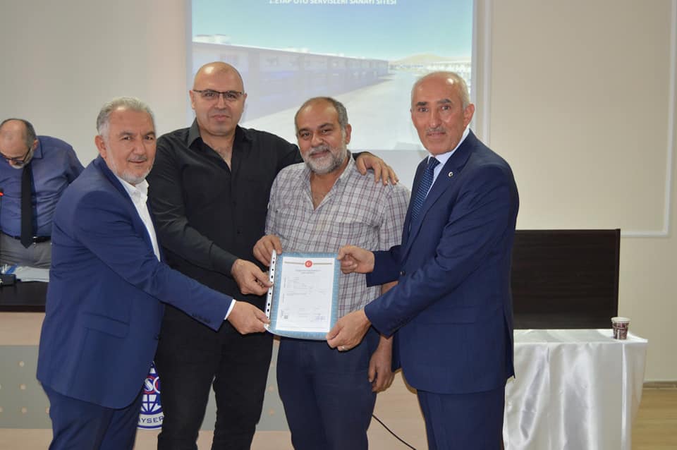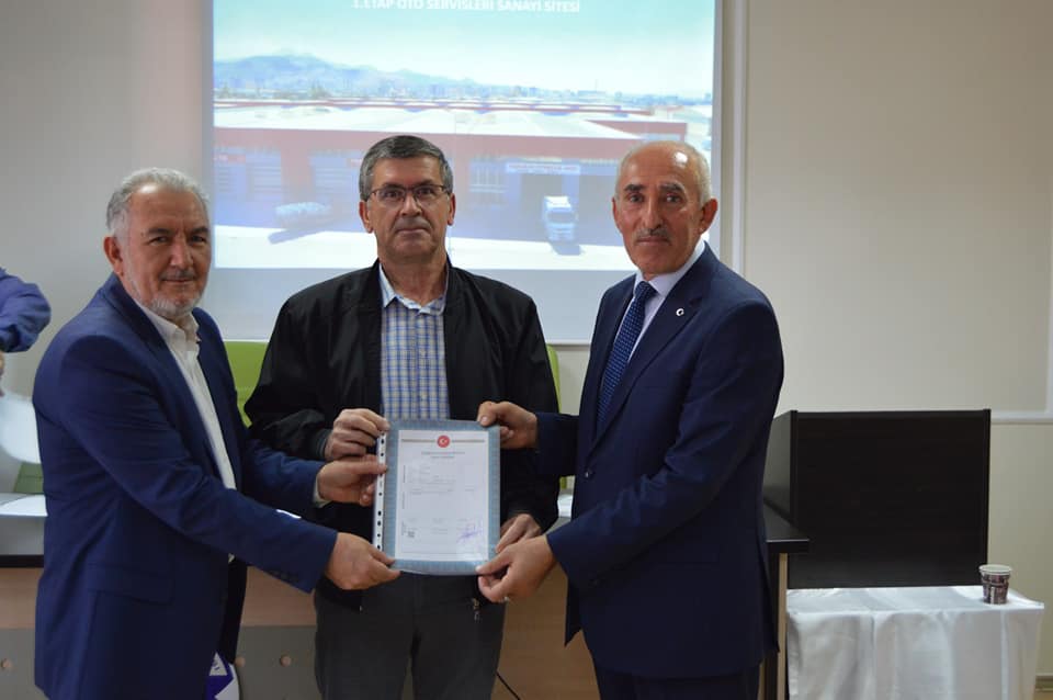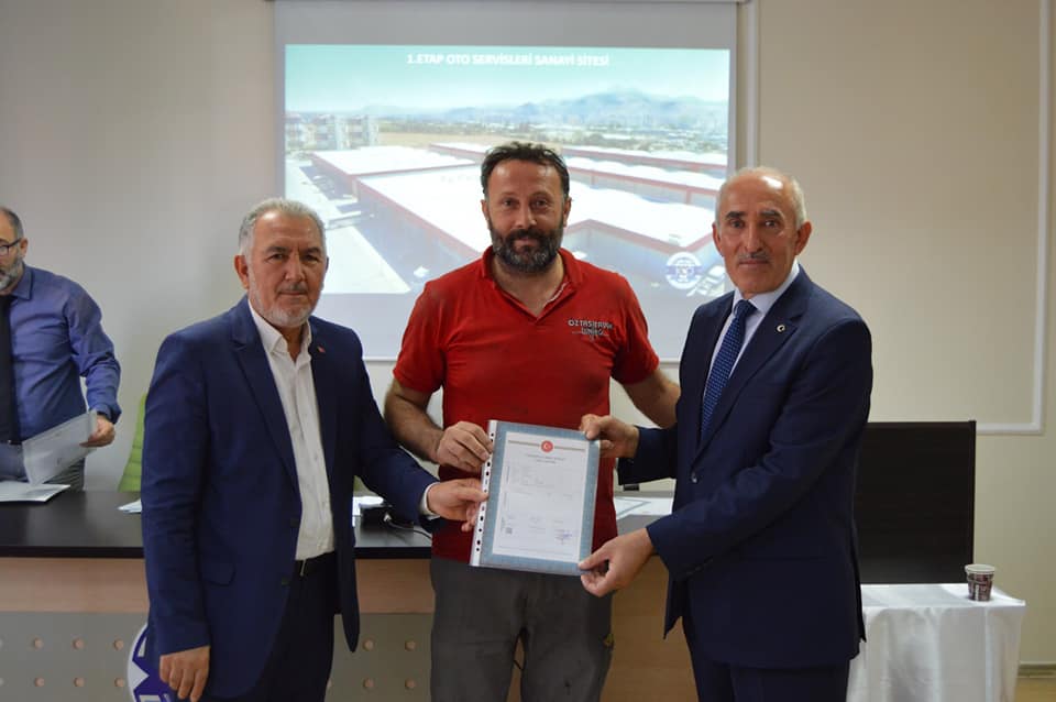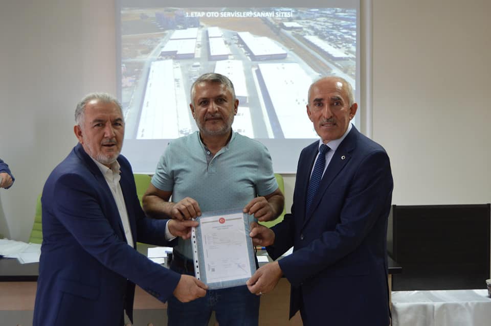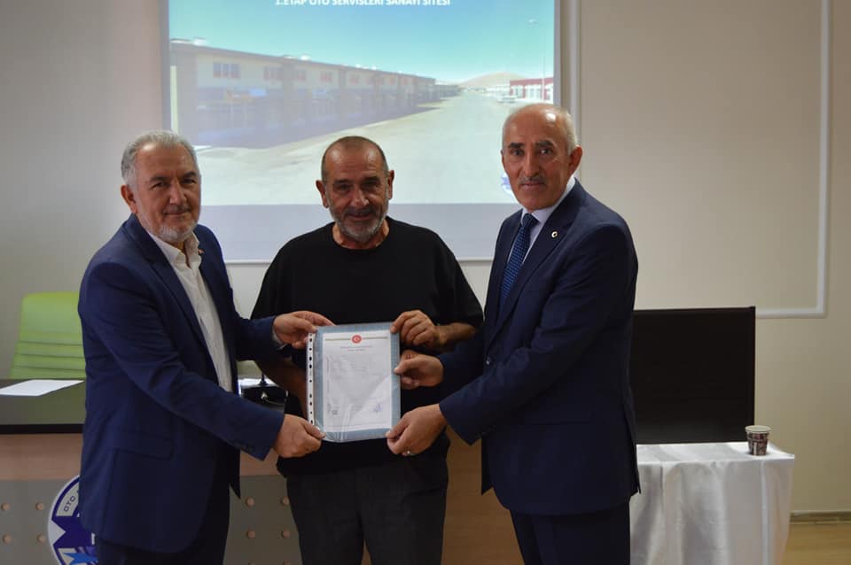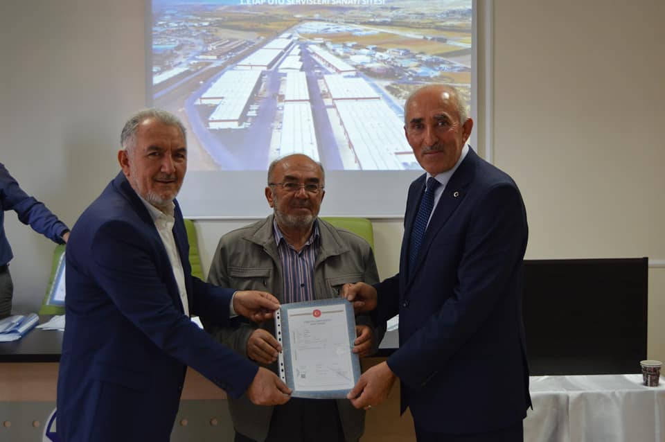 1.Etap Oto Servisleri Sanayi Sitemizin birinci grup üyelerimizin tapularını teslim ettik. Başkanımız Şeyhi Odakır yapmış olduğu konuşmasında, Sanayi ve Teknoloji Bakanlığı desteği ile yapılan işyerlerinin Bakanlığa olan borcunun 4 yıl öncesinden kapatılarak tapularının dağıtıldığını söyledi. Emeği geçen herkese teşekkür ederek, esnaf ve sanatkârlarımıza hayırlı uğurlu olmasını diledi.