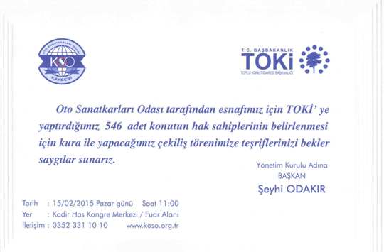 Oto Sanatkarları Odası olarak üyelerimiz ve yanlarında çalışanlar için TOKİ'ye yaptırdığımız 546 adet konut projemizde TOKİ ile yaptığımız istişareler sonucunda kat kurralarını Enerji ve Tabi Kaynaklar Bakanımız Sayın Taner YILDIZ,Kayseri Valimiz sayın Orhan DÜZGÜN,Kayseri Milletvekillerimiz ve Belediye Başkanlarımızın katılımlarıyla yarın saat 11:30 da Kadir Has Kongre Merkezi fuar alanında gerçekleşecek.